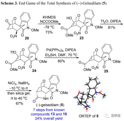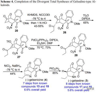 以高效的方式快速構(gòu)建了共同的四環(huán)骨架后,作者隨即進(jìn)行了(-)-gelsidilam的全合成(圖4)。因此,20在KHMDS和Mander試劑(甲基氰基甲酸酯)作用下,在酮基的α-位引入羧甲氧基,產(chǎn)率為73%。接著,在三氟甲磺酸酐和Hünig堿的條件下將烯醇混合物23轉(zhuǎn)化為相應(yīng)的烯醇三氟甲磺酸酯24。隨后利用Pd(PPh3)4和Et3SiH還原脫去三氟甲磺酸酯基團(tuán)得到α,β-不飽和甲酯25。最后,酯25經(jīng)硼氫化鎳介導(dǎo)的烯烴和硝基還原,得到非環(huán)化中間體,其與硅膠在40 ℃下加熱即可得到對(duì)映體富集的(-)-gelsidilam(5)。該合成路線以13和15為起始原料,只經(jīng)7步就能以24%的收率得到(-)-gelsidilam(5)。
