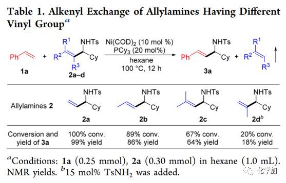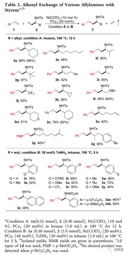 首先,作者研究了苯乙烯(1a)和烯丙胺2a之間的烯基交換,并用Ni(COD)2和PCy3原位產(chǎn)生的鎳催化劑評(píng)估了烯丙胺底物中鏈烯基的作用(Table 1)。首先,含有乙烯基的烯丙胺2a是與苯乙烯反應(yīng)的理想底物,能以99%的產(chǎn)率得到烯丙胺3a;其次,其他烯丙胺與苯乙烯反應(yīng)也可以得到3a。其中,由2d反應(yīng)產(chǎn)生3a的結(jié)果排除了反應(yīng)通過烯烴復(fù)分解機(jī)理進(jìn)行的可能性。