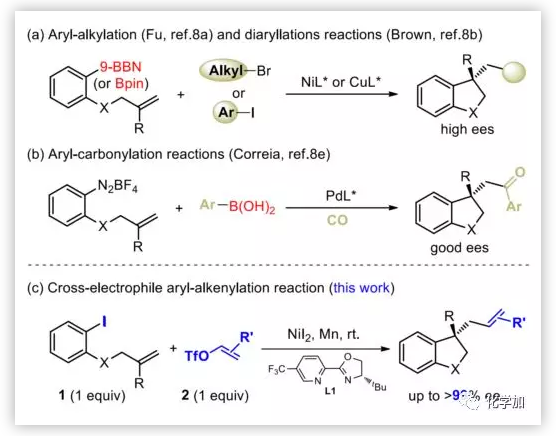 還原偶聯(lián)反應(yīng)近年來已成為構(gòu)筑C-C鍵的有力工具。該方法具有反應(yīng)步驟經(jīng)濟、官能團(tuán)兼容性好等特點,并且在化學(xué)選擇性上可以與傳統(tǒng)偶聯(lián)反應(yīng)形成良好的互補。然而,如何發(fā)展高對映選擇性的還原偶聯(lián)反應(yīng)至今仍是金屬催化領(lǐng)域研究的難點問題。目前,該方向的研究主要集中在發(fā)展以二級烷基親電試劑為手性前體的不對稱還原偶聯(lián)反應(yīng)上。烯烴與親電試劑的不對稱雙能團(tuán)化反應(yīng)可以通過一步構(gòu)筑多個化學(xué)鍵的方式來合成更為復(fù)雜的手性分子。然而由于復(fù)雜的化學(xué)、區(qū)域和立體選擇性等問題,該策略在不對稱領(lǐng)域的應(yīng)用鮮有報道。