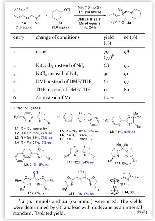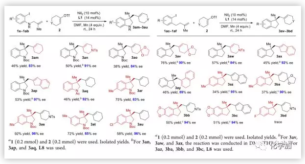 作者首先以烯烴1a與烯基三氟甲磺酸酯2a 的反應(yīng)作為模板底物對反應(yīng)條件進(jìn)行了篩選(圖2)。初步研究表明3a的選擇性受到許多副反應(yīng)的影響,例如Ar-I與三氟甲磺酸烯基酯的直接偶聯(lián)反應(yīng),1a、2a或者環(huán)化中間體的質(zhì)子化和自偶聯(lián)反應(yīng)等。最終,作者以NiI2作為催化劑,手性5-CF3-Pyrox-tBu(L1)作為配體,Mn作為還原劑,在DMF/THF(1:1)中室溫條件下反應(yīng)24 h,以77%的分離產(chǎn)率和98%ee值得到目標(biāo)產(chǎn)物3a。