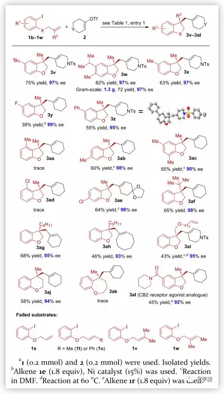 作者還考察了連有芳基碘的烯烴的底物范圍(圖4)。在芳環(huán)上有給電子、吸電子或空間位阻取代基的底物均能很好地兼容(3v-3ae)。此外,反應(yīng)可按比例放大至克級規(guī)模,以72%的收率,97%ee值得到目標(biāo)產(chǎn)物(3z)。通過X-射線衍射分析確定3z的絕對構(gòu)型。在芳基碘的鄰位帶有取代基的底物反應(yīng)僅得到少量的產(chǎn)物3aa和3ad,其中大部分芳基碘化物被質(zhì)子化。相反,在芳基碘的對位或間位帶有取代基的底物反應(yīng)良好,可以中等產(chǎn)率和高對映選擇性得到目標(biāo)產(chǎn)物(3x,3ab,3ac,3ae)。作者還成功引入了具有光學(xué)活性2,3-二氫苯并呋喃片段,這一片段可用于CB2受體激動劑衍生物的合成。目前,單取代、1,2-二取代或者三取代的烯烴反應(yīng)還不可行(1s-1w)。這些底物的反應(yīng)通常得到芳基-烯基直接偶聯(lián)的產(chǎn)物。