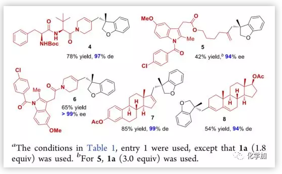 天然產(chǎn)物的后期修飾對獲取高活性生物分子非常重要的意義。作者還將該方法學(xué)應(yīng)用于許多活性大分子的后期修飾中,并以中等收率和高對映選擇性得到相應(yīng)的產(chǎn)物(圖6)。