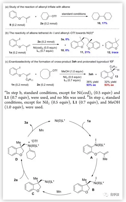 據(jù)報道,烯基-OTf比Ar-I更容易與Pd(0)進(jìn)行氧化加成反應(yīng)。為了對反應(yīng)的機理有全面的認(rèn)識,確定反應(yīng)起始于烯基-OTf還是Ar-I的活化,作者進(jìn)行了許多對照實驗。9與2a反應(yīng)沒有得到交叉偶聯(lián)產(chǎn)物,僅得到17%的烯基二聚體10,表明在該反應(yīng)條件下沒有發(fā)生惰性烯烴與烯基-Ni的分子間遷移插入反應(yīng)(圖7 a)。 在不存在Mn的情況下,1a和2a與Ni(0)(0.5當(dāng)量)的反應(yīng)得到二聚體11,產(chǎn)率為21%,而烯基-OTf未參與反應(yīng)(圖7 b)。 此外,1n與2e的反應(yīng)得到產(chǎn)物3ah和質(zhì)子化副產(chǎn)物13,兩者具有相同的對映選擇性(圖7 c)。這些結(jié)果表明反應(yīng)途徑可能包含Ni(0)與Ar-I先發(fā)生氧化加成反應(yīng),之后進(jìn)行分子內(nèi)遷移插入以及與烯基-OTf的還原偶聯(lián)。因此作者提出下圖所示的催化循環(huán)。首先Ar-I與Ni(0)的氧化加成反應(yīng)可能得到中間體A,隨后經(jīng)歷對映選擇性的遷移插入過程得到物種B;用Mn還原B,然后與2a氧化加成及還原消除,得到交叉產(chǎn)物3a。