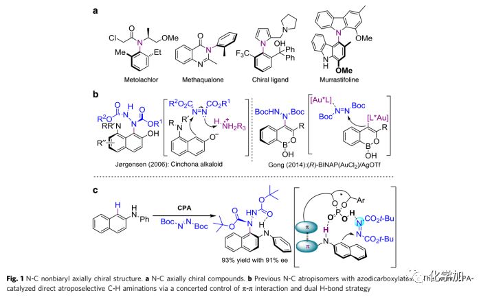 軸手性化合物廣泛存在于手性催化劑及配體中,其化學(xué)合成備受關(guān)注。BINAP和BINOL等二芳基軸手性化合物的合成已經(jīng)取得了不錯(cuò)的進(jìn)展,但關(guān)于合成同樣重要的非二芳基N-C軸手性化合物(Fig. 1a)的報(bào)道卻很少。到目前為止,合成非二芳基N-C軸手性化合物的方法主要包括手性拆分和對(duì)非手性N-C鍵化合物進(jìn)行不對(duì)稱環(huán)化反應(yīng)、N-官能團(tuán)化反應(yīng)和去對(duì)稱化反應(yīng)等,而通過構(gòu)建新的N-C鍵合成手性非二芳基N-C軸手性化合物仍然面臨巨大的挑戰(zhàn)。