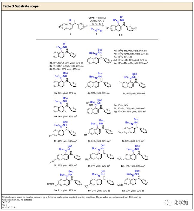 確定N-苯基-2-萘胺1d和DBAD 2a為模板底物后,作者通過對(duì)催化劑、溶劑、溫度等反應(yīng)條件進(jìn)行篩選,確定最優(yōu)的反應(yīng)條件(Table 2):10 mol% CPA6為催化劑,DCM:Et2O = 7:3為溶劑,在-70 ℃條件下反應(yīng)48 h,能以93%的收率和91%的對(duì)映選擇性得到相應(yīng)產(chǎn)物。