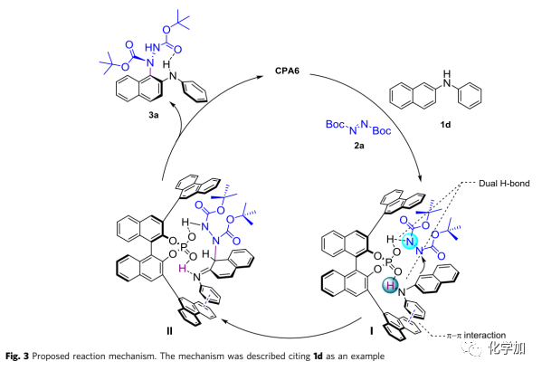根據(jù)實(shí)驗(yàn)結(jié)果以及前人的報(bào)道,作者推測可能的機(jī)理(Fig. 3):首先,CPA通過雙重氫鍵活化模式同時(shí)活化N-苯基-2-萘胺和偶氮二羧酸酯生成中間體I。然后,在π-π相互作用下,N-苯基-2-萘胺與偶氮二羧酸酯發(fā)生親核加成反應(yīng)生成中間體II。II重新芳構(gòu)化生成胺化產(chǎn)物3a。
