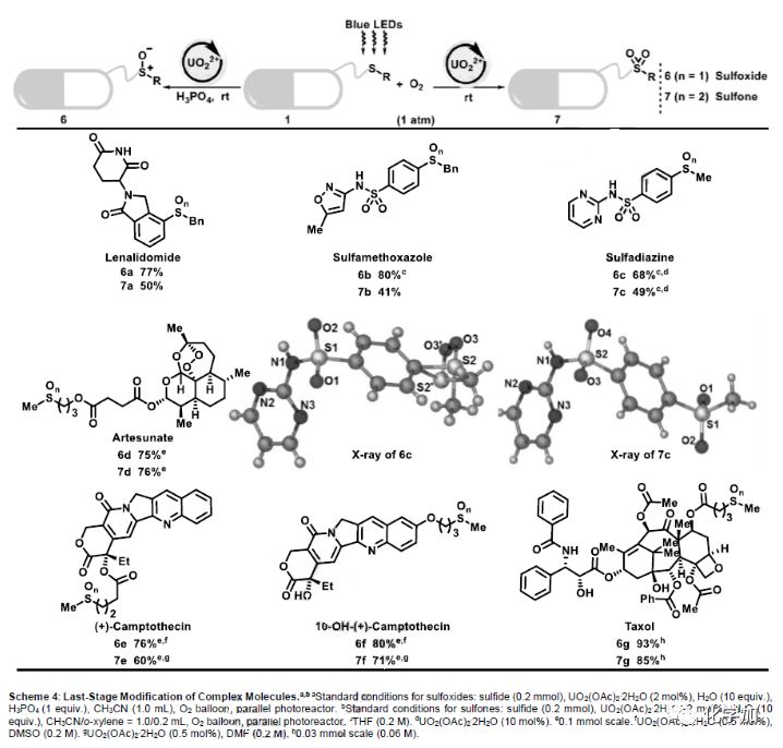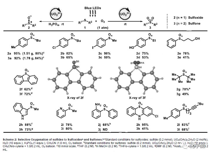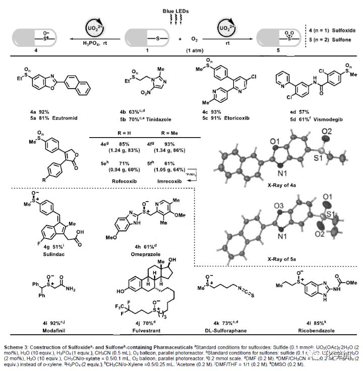 在最優(yōu)條件下,作者考察了鈾?;栯x子催化的砜和亞砜氧化反應(yīng)的普適性(Scheme 2)。在標準條件下,2a和3a能高效地進行克級規(guī)模制備。鹵素(2b和3b),甚至光敏碘(2c和3c)的耐受性都很好。酚 (2d和3d)和醇類化合物(2e和3e)均能被有效制備。二苯并[b,d]噻吩(2f和3f)的氧化反應(yīng)也能順利進行,其產(chǎn)物是重要的OLED材料。具有高空間位阻和弱C-S鍵的二叔丁基硫化物也可完成選擇性氧化(2g和3g)。此外,各種含氮骨架,如未保護的吲哚(2h和3h)和吡啶(2i和3i)也能耐受。含未保護的伯芳胺(2j)的底物也能以中等產(chǎn)率實現(xiàn)轉(zhuǎn)化,但由于胺對UO22+的強淬滅作用,相關(guān)砜的合成未實現(xiàn)。10H-吩噻嗪是合成抗精神病藥物(氯丙嗪,美索丙嗪,氟奮乃靜,硫利達嗪)的關(guān)鍵中間體,其能夠在無需保護胺的情況下進行選擇性氧化(2k和3k)。即使在氧合條件下敏感的內(nèi)部炔烴,也是兼容的(2l和3l)(Scheme 2)。