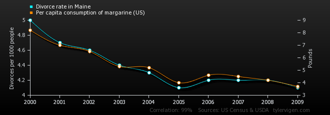 ○ 美國緬因州的離婚率(藍(lán))與人造黃油的人均消費(fèi)量(橙)。| 圖片來源:Tyler Vigen/Spurious Correlations