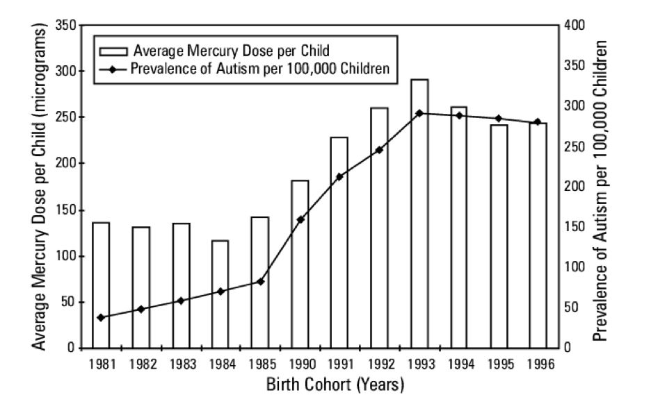 ○ 通過接觸疫苗而接觸到汞(柱狀圖)與自閉癥的發(fā)病率(點(diǎn)線圖)。| 圖片來源:David Geier and Mark Geier