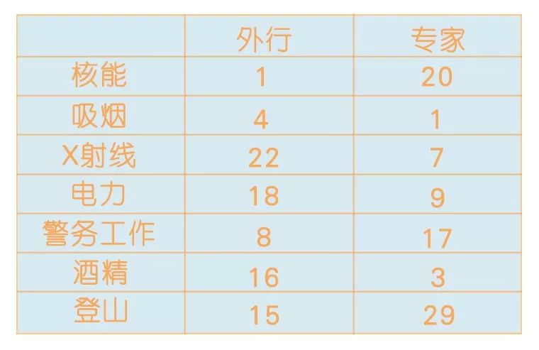 研究表明,人們對風(fēng)險(xiǎn)的排名差異很大。下面列出的是1979年公眾和專家對風(fēng)險(xiǎn)的排名概況,1代表風(fēng)險(xiǎn)最高,30代表風(fēng)險(xiǎn)最低。