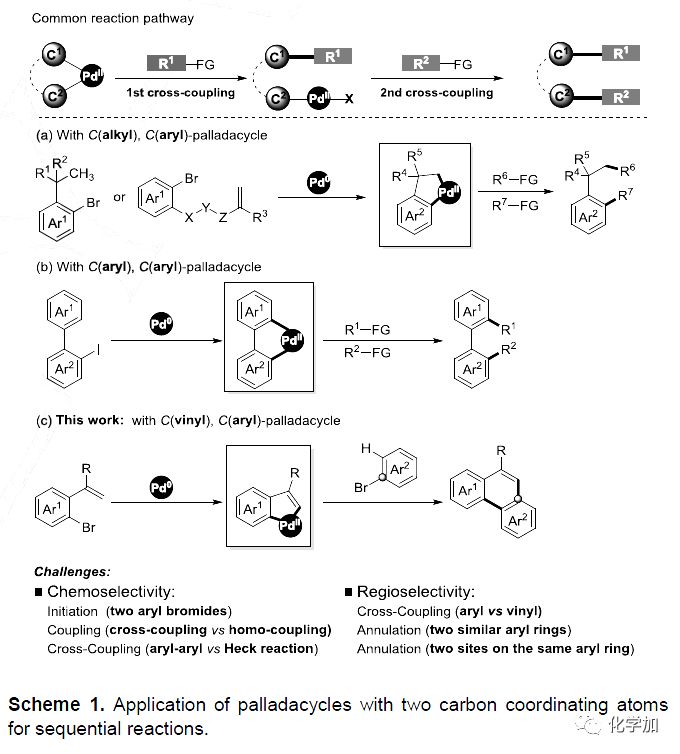 發(fā)展高效的合成方法和提高方法的應用價值,是現(xiàn)代有機合成化學的目標之一。串聯(lián)反應常??梢栽谝徊椒磻袑崿F(xiàn)多個組分的官能團化,因此引起了化學家們的廣泛關注。而C-C環(huán)鈀物種作為一類重要的反應中間體也被頻繁應用于各種有機轉(zhuǎn)化中,但相關報道常見于C-C芳基/烷基環(huán)鈀和C-C芳基/芳基環(huán)鈀,有關C-C芳基/烯基環(huán)鈀的工作則相對較少。