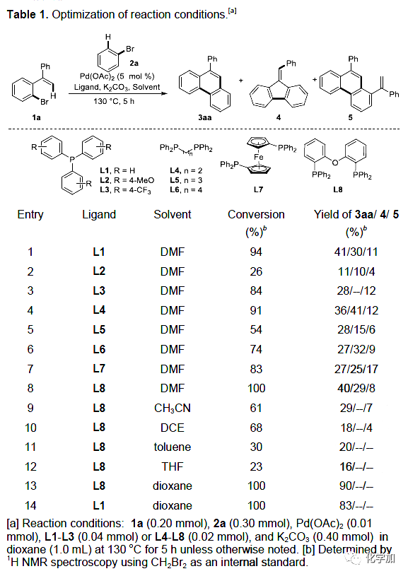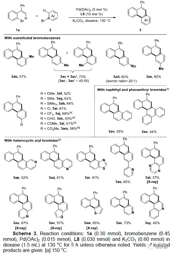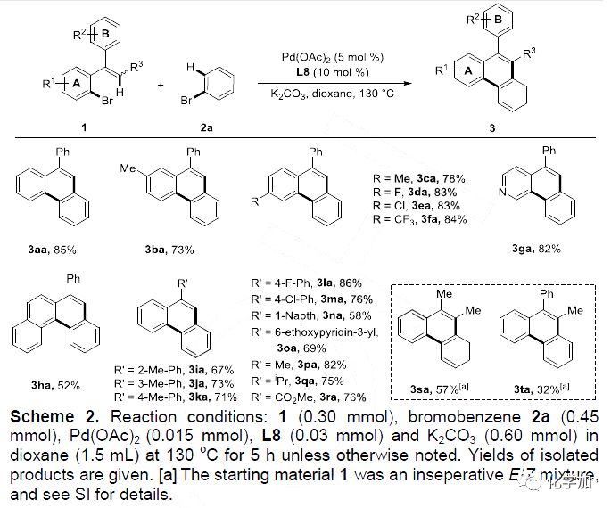 首先,作者以1a和2a為模型底物,考察了配體,溶劑等對反應轉(zhuǎn)化率和收率的影響(Table 1)。該反應在常見的雙膦和單膦配體下均可順利獲得菲類產(chǎn)物3aa,但是也伴有副產(chǎn)物芴類化合物4和雙分子聚合產(chǎn)物5。在隨后的溶劑考察中,這兩種副產(chǎn)物在L8為配體,dioxane為溶劑的體系中均可被有效地降低。另外,L1作為配體在該溶劑體系下,也可使反應獲得理想的產(chǎn)率。