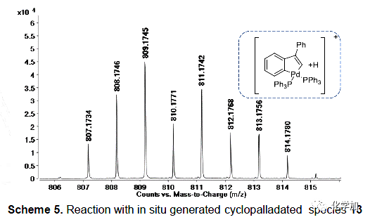 接下來,作者對反應的機理進行了研究。通過SAESI-MS (Scheme 5),順利地在分步反應和反應液中均捕捉到了活性較高而難于分離的環(huán)鈀中間體,通過高分辨質(zhì)譜,二級碎片及同位素分布分析,證實了該中間體的存在。而同位素動力學實驗則闡明了兩個C-H斷裂過程對反應速率的影響。基于此,作者提出了兩種可能的催化循環(huán),根據(jù)一系列實驗結(jié)果認為循環(huán)II為主要的機制(Scheme 6)。