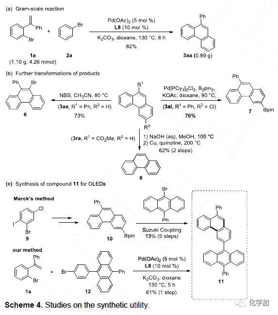 為了體現(xiàn)該方法的合成價值(Scheme 4),作者也實現(xiàn)了該反應的克級規(guī)模放大和相關化合物的多種轉(zhuǎn)化。值得注意的是,Merck公司報道的通過5步以13%的產(chǎn)率合成的具有OLED效應化合物11,利用該方法通過簡單和商品化的原料僅需一步反應,便能以61%的產(chǎn)率得到。
