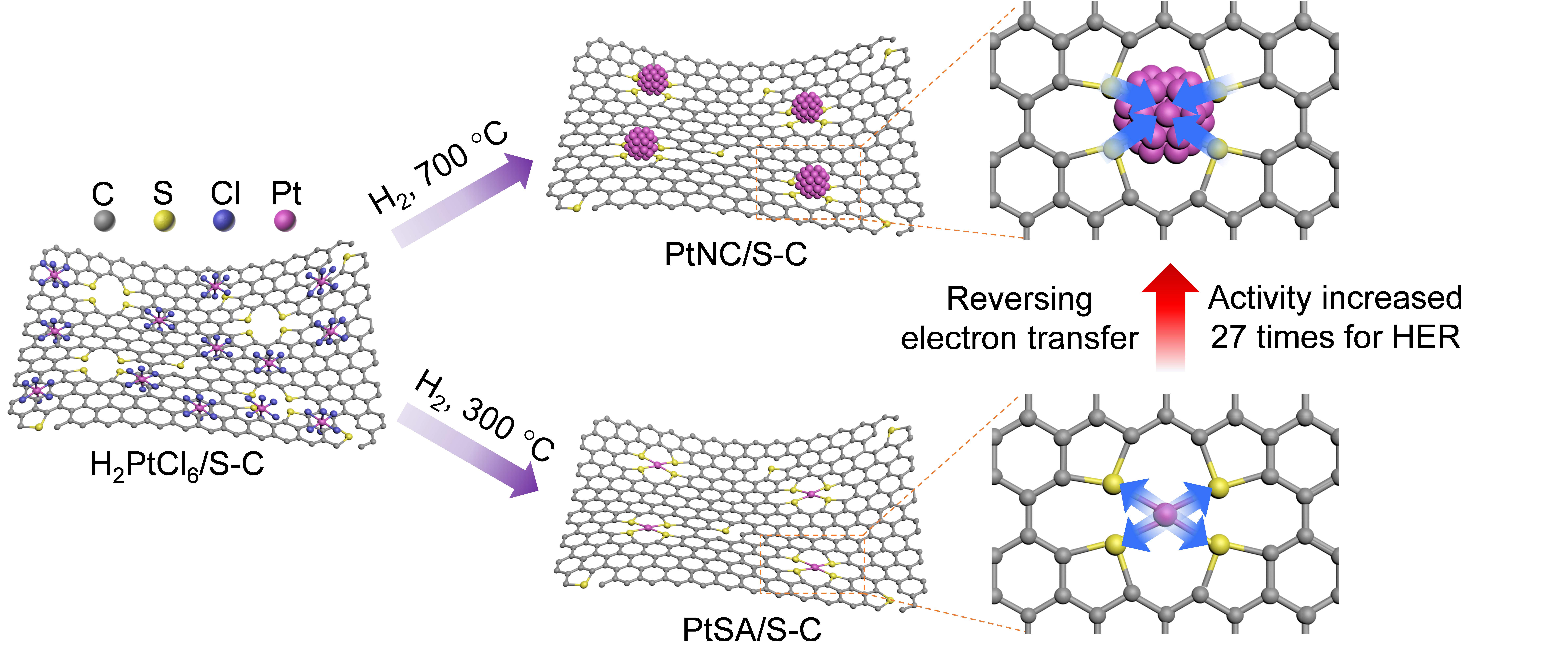 圖1. S-C負載的Pt單原子與Pt納米團簇合成示意圖以及電荷轉(zhuǎn)移變化。