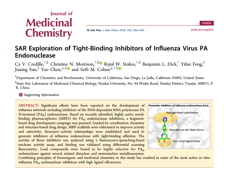 南開(kāi)大學(xué)藥學(xué)院、藥物化學(xué)生物學(xué)國(guó)家重點(diǎn)實(shí)驗(yàn)室陳瑤研究員與加利福尼亞大學(xué)圣迭戈分校Seth M. Cohen教授為論文的共同通訊作者。
