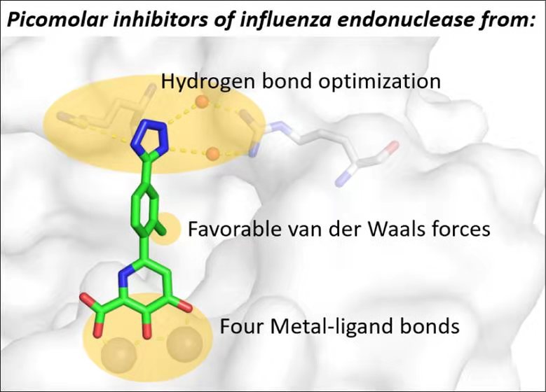 在抗流感病毒藥物的開(kāi)發(fā)中,PAN核酸內(nèi)切酶抑制劑的研究獲得了廣泛的關(guān)注。課題組基于最近發(fā)現(xiàn)的抑制PAN內(nèi)切酶的高活性金屬結(jié)合藥效團(tuán)(MBPS),運(yùn)用了基于片段的藥物挖掘策略(Fragment Based Lead Discovery),以配位化學(xué)和構(gòu)效關(guān)系分析(SAR)為指導(dǎo),發(fā)展了MBP骨架,并不斷提高其活性和選擇性,合成了具有高親和力和結(jié)合能力的流感核酸內(nèi)切酶抑制劑。同時(shí),所開(kāi)發(fā)的先導(dǎo)化合物對(duì)幾類相關(guān)的雙核和單核金屬酶具有高選擇性。結(jié)合生物無(wú)機(jī)和藥物化學(xué)的原理和方法,該團(tuán)隊(duì)創(chuàng)新性的開(kāi)發(fā)了一系列高效的病毒PAN內(nèi)切酶抑制劑,具有良好的抗流感病毒活性。該工作為抗病毒藥物的研究以及新型抑制劑類藥物的開(kāi)發(fā)提供了新的思路和策略。