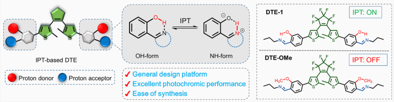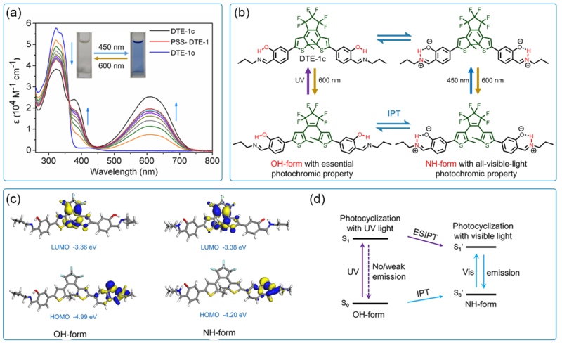 分子內(nèi)質(zhì)子轉(zhuǎn)移(Intramolecular Proton Transfer, IPT)是一個普遍存在于氫鍵體系中的現(xiàn)象,如在水楊基亞胺類化合物中,活潑氫在質(zhì)子給體酚羥基與質(zhì)子受體亞胺鍵之間存在動態(tài)轉(zhuǎn)移平衡過程,當(dāng)活潑氫從氧原子轉(zhuǎn)移到氮原子上,即從OH-構(gòu)型轉(zhuǎn)移到NH-構(gòu)型,與OH-構(gòu)型相比,該課題組創(chuàng)新利用IPT產(chǎn)生的NH-構(gòu)型吸收紅移,從而率先實現(xiàn)全可見光驅(qū)動的光致變色現(xiàn)象(all-visible-light triggered photochromism),同時也兼顧了其優(yōu)異的光調(diào)控效率和良好的熱穩(wěn)定性、優(yōu)異的抗疲勞度等性能。作為一種通用的設(shè)計策略,該分子內(nèi)質(zhì)子轉(zhuǎn)移單元IPT的引入,首次發(fā)展成可靠的模塊設(shè)計全可見光驅(qū)動的二噻吩乙烯染料體系,可有效避免短波長的紫外光,最終以更溫和的可見光替代紫外光激發(fā)其光異構(gòu)化過程,成功拓寬其應(yīng)用領(lǐng)域,為全可見光調(diào)控二噻吩乙烯光致變色染料及光開關(guān)的設(shè)計提供了簡單有效、直接明確的新思路。
