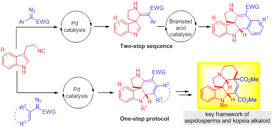 廣州大學(xué)化學(xué)化工學(xué)院劉運(yùn)林副教授課題組一直致力于吲哚啉及含氟化合物的合成研究。最近,他們在前期工作基礎(chǔ)上進(jìn)一步設(shè)計(jì)并實(shí)現(xiàn)了3-(2-異氰乙基)吲哚可以與重氮化合物通過交叉偶聯(lián)/螺環(huán)化/Mannich-type串聯(lián)反應(yīng),合成了一系列具有兩個連續(xù)手性中心的多環(huán)螺吲哚啉骨架。該策略對于α-芳基取代的重氮底物,由于芳基的親核性較弱,反應(yīng)選擇性生成三環(huán)螺吲哚啉化合物。在手性磷酸的催化下,這些三環(huán)螺吲哚啉化合物可以進(jìn)行后續(xù)的分子內(nèi)Mannich-type環(huán)化反應(yīng),進(jìn)而成功實(shí)現(xiàn)了多環(huán)螺吲哚啉的不對稱合成。該方法反應(yīng)條件溫和,操作簡單,底物普適性廣,產(chǎn)率較高、官能團(tuán)兼容性良好。利用此方法,他們通過幾步簡單的化學(xué)轉(zhuǎn)化簡潔高效地完成了aspidosperma和 kopsia生物堿五環(huán)核心骨架的構(gòu)建,為日后這兩類天然產(chǎn)物的全合成提供了新的研究思路與方法。此外,該研究工作進(jìn)一步豐富了3-(2-異氰乙基)吲哚的反應(yīng)模式,為多環(huán)螺吲哚啉的合成提供了新路徑,產(chǎn)物有望在藥物研發(fā)中得到應(yīng)用。該研究成果最近發(fā)表在化學(xué)類頂級期刊《德國應(yīng)用化學(xué)》(IF= 12.25)上,獲國際同行評審專家的高度評價(jià):(1個high important,1個very important),并受編輯邀請制作封面?;瘜W(xué)化工學(xué)院劉運(yùn)林副教授為論文的唯一通訊作者,廣州大學(xué)為論文的唯一通訊單位。