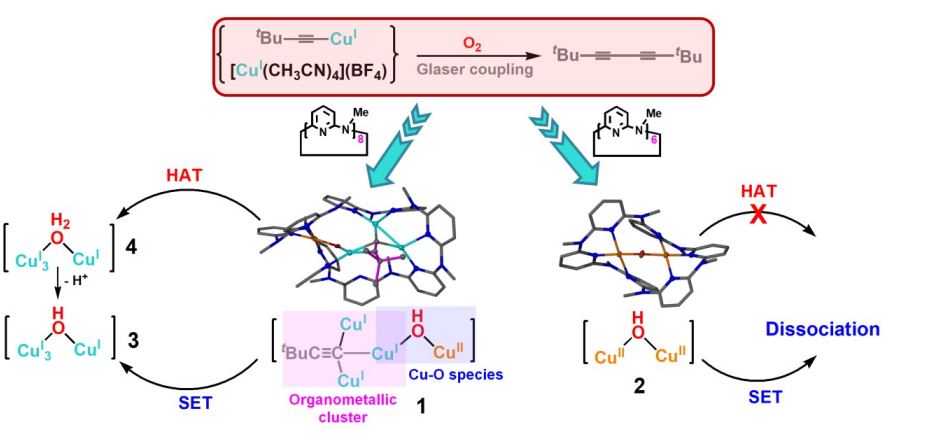 近日,他們利用大環(huán)模板導(dǎo)向的策略,通過使用不同大小的大環(huán)配體,在同一個(gè)Glaser偶聯(lián)反應(yīng)體系中成功分離到銅-氧-有機(jī)三元復(fù)合物中間體[(tBuCoCCuI3)-(m2-OH)-CuII]@Py[8](1)和較常見的雙核Cu-O化合物 [CuII-(m2-OH)-CuII]@Py[6](2)。研究表明化合物1和2雖然具有相似的配位環(huán)境,但卻表現(xiàn)出截然不同的氧化能力和反應(yīng)活性。具有銅-氧-有機(jī)三元復(fù)合體系的化合物1表現(xiàn)出較強(qiáng)的氧化能力,能夠與多種有機(jī)化合物發(fā)生單電子轉(zhuǎn)移(SET)或氫原子轉(zhuǎn)移(HAT)反應(yīng)。而化合物2中[CuII-(m2-OH)-CuII]則表現(xiàn)出較弱的氧化能力,因此不具備HAT反應(yīng)活性。本研究揭示了在Cu/O2催化體系中原位生成的高活性銅-氧-有機(jī)三元復(fù)合物很有可能是真正的催化反應(yīng)中間體,其反應(yīng)活性與銅-氧物種以及有機(jī)銅化合物有較大的差別,為后續(xù)研究其他Cu/O2有機(jī)催化體系以及含銅金屬酶的反應(yīng)機(jī)理提供了新的思路。