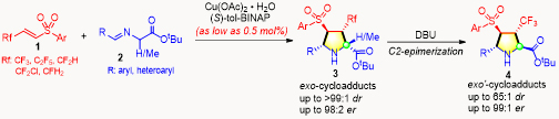 導(dǎo)讀:Angew. 武漢理工大學(xué)化學(xué)化工與生命科學(xué)學(xué)院黃毅勇教授課題組致力于手性含氟雜環(huán)化合物的催化不對稱合成方法學(xué)研究,針對含三氟甲基多取代四氫吡咯化合物的重要性和合成難題,巧妙設(shè)計合成了一類新型含三氟甲基不飽和砜化合物,在完成與硝酮的催化不對稱1,3-偶極環(huán)加成反應(yīng)之后(Angew. Chem. Int. Ed. 2017, 56, 1510–1514),繼續(xù)將其應(yīng)用于甲亞胺葉立德的1,3-偶極環(huán)加成反應(yīng)中。