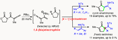黃毅勇教授課題組還基于目前亞胺與聯(lián)烯之間的親核性催化反應(yīng)體系只涉及兩性離子反應(yīng)中間體的研究現(xiàn)狀,突破現(xiàn)有反應(yīng)模式,創(chuàng)新性的提出用噁唑烷酮衍生的聯(lián)烯酰亞胺代替聯(lián)烯基酯,在叔膦催化劑作用下生成手性雙親電性中間體,最終實現(xiàn)首例聯(lián)烯與亞胺、烯胺和酰胺之間的[4 + 1]環(huán)加成反應(yīng),分別構(gòu)建了全取代烯胺酮、含全碳手性中心的β-酮亞胺及γ-內(nèi)酰胺等重要骨架分子,將為發(fā)展一系列聯(lián)烯酰亞胺與不同類型雙親核試劑的不對稱[4 + n]環(huán)加成反應(yīng)及一些天然產(chǎn)物的簡潔合成奠定重要基礎(chǔ)。論文同樣發(fā)表在化學(xué)領(lǐng)域頂級期刊《Angew. Chem. Int. Ed. 2019, ASAP, DOI: 10.1002/anie.201912263》,第一作者為碩士研究生曹澤混,黃毅勇教授為唯一通訊作者。