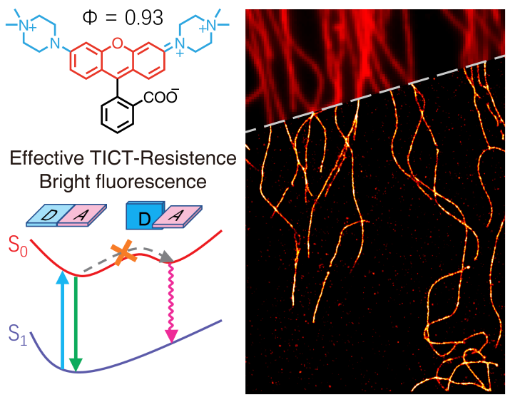 如圖1所示,利用季銨基團吸電子效應,抑制染料在激發(fā)態(tài)形成扭曲電荷轉移過程,降低分子扭曲導致的能量損耗,從而增強熒光發(fā)射。實驗表明,季銨化染料(以羅丹明類為例)確實具有更高的單分子亮度及更多的總收集光子數(shù),非常適合單分子定位超分辨成像。研究者應用季銨化羅丹明標記的抗體進行了微管超分辨成像(圖1右)。