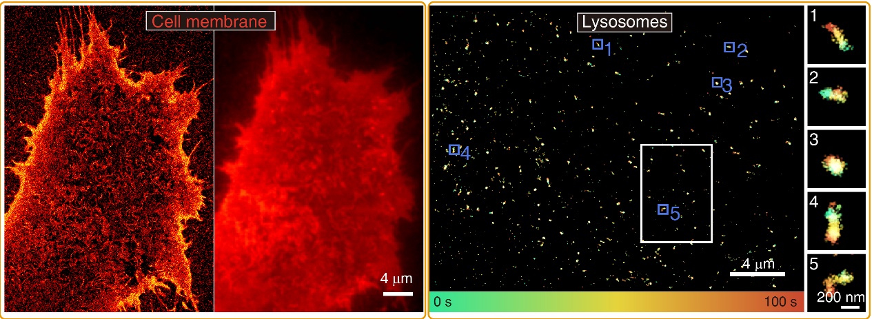 此外,為了在活細胞水平上驗證季銨化染料的成像優(yōu)勢,進一步開發(fā)了兩種針對亞細胞器標記的探針,即細胞膜探針(Mem-R)和溶酶體探針(Lyso-R)。二者均在活細胞靶標位置展現(xiàn)出閃爍的單分子信號特征。基于這些閃爍的單分子信號,成功地對活細胞的細胞膜和溶酶體進行了定位型超分辨成像(圖2)。