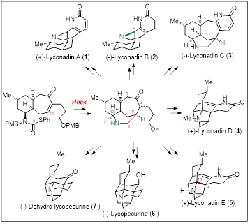 楊旸教授團(tuán)隊(duì)一直致力于具有良好生物活性的復(fù)雜天然產(chǎn)物的全合成研究。石松類生物堿是從蕨類植物石松及其近緣植物中分離得到的結(jié)構(gòu)相似且骨架多變的一類天然產(chǎn)物。很多石松類生物堿有良好的神經(jīng)營養(yǎng)活性,其中最為著名的是石杉?jí)A甲。為實(shí)現(xiàn)多個(gè)具有良好神經(jīng)營養(yǎng)活性的石松類生物堿的發(fā)散性合成,該團(tuán)隊(duì)發(fā)展了一種新穎的過渡金屬Pd催化的Heck環(huán)化反應(yīng)來構(gòu)建合成難度很高的七元橋環(huán)骨架,進(jìn)而實(shí)現(xiàn)了對(duì)[4.2.1], [4.3.1]及[6/6/7]等多種氮雜橋環(huán)化合物的合成,并將此方法應(yīng)用到了石松類生物堿 Lyconadins A-E的不對(duì)稱全合成研究。團(tuán)隊(duì)從關(guān)鍵的[6/6/7]-氮雜橋環(huán)中間體出發(fā),經(jīng)過一系列官能團(tuán)化操作最終實(shí)現(xiàn)了多個(gè)天然產(chǎn)物L(fēng)yconadins A-E的高效合成,其中天然產(chǎn)物L(fēng)yconadins D和E為首次全合成。該項(xiàng)研究工作為一系列具有良好神經(jīng)營養(yǎng)活性的石松類生物堿的全合成奠定了基礎(chǔ),對(duì)篩選針對(duì)神經(jīng)系統(tǒng)疾病的藥物先導(dǎo)化合物具有重要意義。