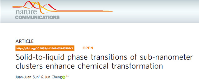 程俊教授課題組首次結(jié)合從頭算分子動(dòng)力學(xué)模擬和自由能計(jì)算方法詳細(xì)研究了模型基元反應(yīng)與金團(tuán)簇結(jié)構(gòu)動(dòng)態(tài)演化耦合效應(yīng),準(zhǔn)確計(jì)算沿反應(yīng)坐標(biāo)的自由能曲線,獲得反應(yīng)自由能變化和能壘。通過系統(tǒng)研究不同溫度下的自由能變化,觀察到反應(yīng)自由能隨溫度升高而異常降低,并且發(fā)現(xiàn)反應(yīng)熵變?cè)谔囟囟葏^(qū)間出現(xiàn)一個(gè)由基元反應(yīng)過程中團(tuán)簇準(zhǔn)一級(jí)固-液相變?cè)斐傻念惛咚狗植嫉木薮蠓逯?。在亞納米團(tuán)簇催化劑上,反應(yīng)物種的吸附狀態(tài)(從反應(yīng)物經(jīng)過渡態(tài)至產(chǎn)物)可以改變團(tuán)簇的相變溫度,進(jìn)而導(dǎo)致在特定溫度區(qū)間團(tuán)簇從固態(tài)變成液態(tài)。相變導(dǎo)致的巨大熵增使得反應(yīng)自由能驟降,推動(dòng)反應(yīng)進(jìn)行。