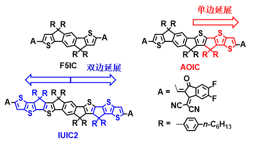 單邊延展及雙邊延展分子設(shè)計示意圖以及稠環(huán)電子受體分子結(jié)構(gòu)
