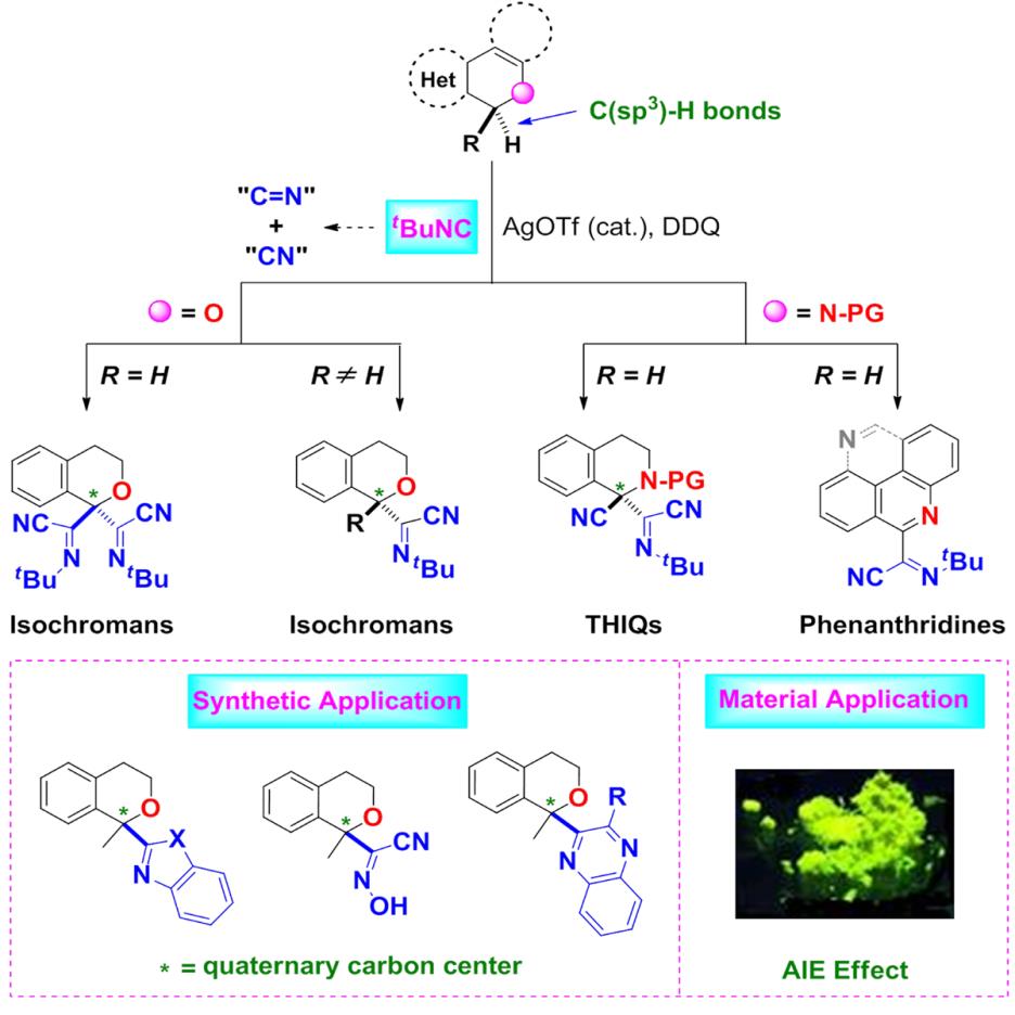 本次課題組在異腈研究方面又取得了新的突破。利用銀試劑作催化劑及DDQ作為氧化劑,實現(xiàn)了異腈對惰性的雜原子鄰位的C(sp3)-H鍵的連續(xù)插入,合成了一系列此前難于得到的氰基亞胺類化合物。通過ESI-MS/MS質(zhì)譜技術(shù)證實了產(chǎn)物氰基亞胺結(jié)構(gòu)中的氰基(CN)及亞胺結(jié)構(gòu)(C=N-R)均來自異腈。該方法避免了使用劇毒的無機(jī)氰化物,可高效構(gòu)建具有叔碳中心的復(fù)雜分子。研究結(jié)果表明,相關(guān)氰基亞胺類分子可以高效轉(zhuǎn)化為多個具有生物活性的分子。同時,利用該方法對材料分子進(jìn)行結(jié)構(gòu)修飾時發(fā)現(xiàn),氰基亞胺是一類具有重要潛力的聚集誘導(dǎo)發(fā)光源(AIEgen),該性質(zhì)使得該類結(jié)構(gòu)在生物檢測和成像、細(xì)胞器染色、病原體識別等領(lǐng)域具有重要潛力。該工作為異腈在C(sp3)-H鍵官能團(tuán)化方面的一個重要突破,尤其適合對復(fù)雜生物活性分子及材料分子進(jìn)行后期官能團(tuán)化修飾(Late-stage functionalization)。