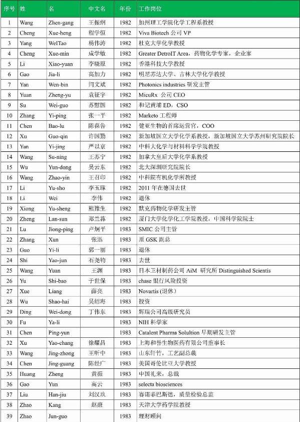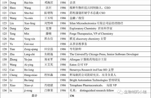 微信公眾號“生物制藥小編”統(tǒng)計了136名項目畢業(yè)生去向,他們大多都成為了學術(shù)界和業(yè)界領(lǐng)軍人物和中堅力量。中美合作化學研究生項目雖然僅僅只持續(xù)五年,培養(yǎng)了一批具有國際競爭力的一流科學家和制藥行業(yè)企業(yè)家。這些在美國工作多年,積累了先進研究方法和產(chǎn)業(yè)經(jīng)驗的專業(yè)人士回國后,極大助力我國醫(yī)藥研發(fā)行業(yè)的發(fā)展。