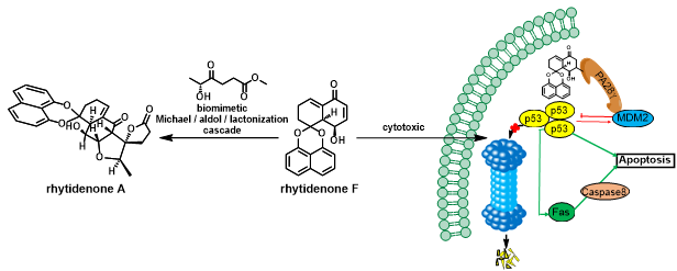 圖1. Rhydidenone A的仿生合成與rhydidenone F的抗腫瘤生物學機制。