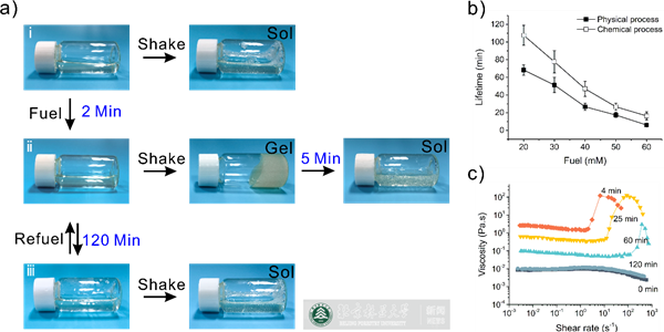 雖然納米生物基懸浮液常用于制備剪切增稠液,但是存在修飾難、透明度差以及易相分離等問題。為此,他們采用疏水締合聚合物來代替納米基懸浮液,并控制聚合物分子量以及疏水改性取代度,實(shí)現(xiàn)高剪切速率誘導(dǎo)下的疏水聚電解質(zhì)分子間交聯(lián),達(dá)到剪切增稠的目的。同時(shí),利用耗散熱力學(xué)(dissipation-control)而非經(jīng)典熱力學(xué)原理(thermal equilibrium-control),通過尿素-脲酶反應(yīng)控制體系pH變化,進(jìn)一步誘導(dǎo)聚合物線團(tuán)構(gòu)象隨時(shí)間變化,實(shí)現(xiàn)了非牛頓流體能夠自發(fā)在剪切變稀與剪切增稠兩種截然不同現(xiàn)象之間轉(zhuǎn)換(圖1)。