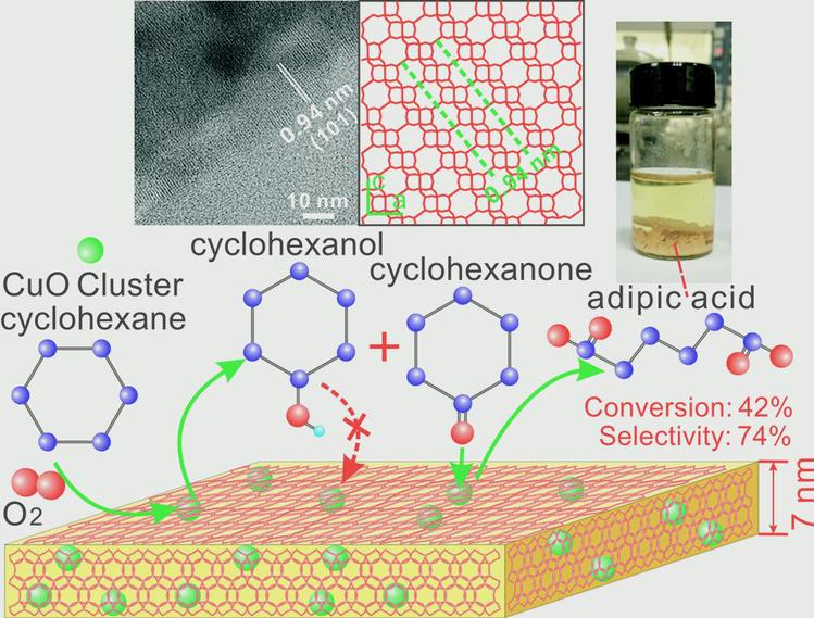 圖2. 二維超薄CuO@SAPO-34分子篩新材料一鍋煮催化氧氣氧化環(huán)己烷制取己二酸的過程示意圖。