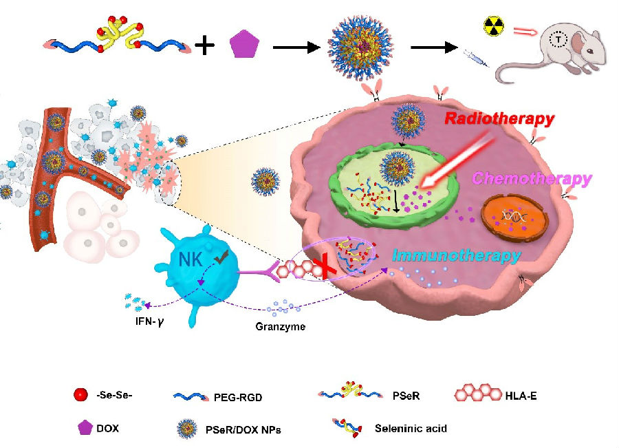 為了進一步提高含硒納米藥物在體內(nèi)的治療效果,該團隊將含有二硒鍵的高分子表面接枝了腫瘤靶向多肽RGD,并通過包裹乳腺癌常用的化療藥物阿霉素制備了具有腫瘤靶向作用的納米顆粒PSeR/DOX。研究者們利用電噴霧質(zhì)譜、核磁共振、紅外光譜、動態(tài)光散射和透射電子顯微鏡等技術(shù),證明了含硒納米顆粒在放療作用下的解聚,阿霉素藥物的釋放以及亞硒酸結(jié)構(gòu)的生成。細胞毒性結(jié)果顯示亞硒酸分子與阿霉素化療和放療具有較為顯著協(xié)同抗腫瘤作用。動物實驗進一步表明,這種免疫治療、放療與化療的聯(lián)合療法具備更為有效的抗腫瘤活性與較低的毒副作用。該成果發(fā)表于Advanced Materials(DOI: 10.1002/adma.201907568)。文章標題為“Selenium-Containing Nanoparticles Combine the NK Cells Mediated Immunotherapy with Radiotherapy and Chemotherapy”。許華平教授為本文通訊作者,第一作者為高世乾博士。