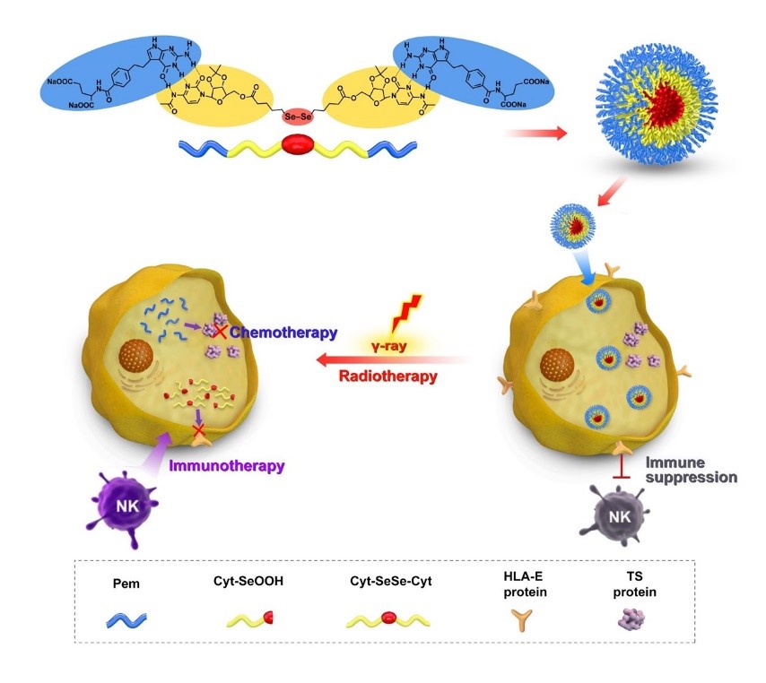 近日,清華大學(xué)的許華平教授團隊發(fā)展了一系列含硒納米藥物,將癌癥免疫治療與化療、放療相結(jié)合,顯著提高了免疫治療的抗腫瘤活性,為癌癥聯(lián)合療法的設(shè)計提供了新的策略。含胞嘧啶的二硒化合物(Cyt-SeSe-Cyt)可以與癌癥臨床治療中常用的化療藥物培美曲塞形成共組裝體。在臨床化療中常用的5 Gy低劑量伽馬射線輻照下,二硒鍵會發(fā)生斷裂生成亞硒酸,抑制癌細胞表面人類白細胞抗原E(HLA-E)的表達,進而阻斷自然殺傷(NK)細胞的抑制性免疫檢查點,從而提高NK細胞殺傷活性。與此同時,三重氫鍵也會發(fā)生斷裂,使得化療藥物培美曲塞從組裝體中釋放,發(fā)揮其抗腫瘤效果。相關(guān)成果以“Diselenide-Pemetrexed Assemblies for Combined Cancer Immuno-, Radio-, and Chemotherapies”為題發(fā)表在Angewandte Chemie International Edition, 2020, 59, 2700-2704。許華平教授和高世乾博士為本文共同通訊作者,清華大學(xué)博士生李天予和潘爍炯為共同第一作者。