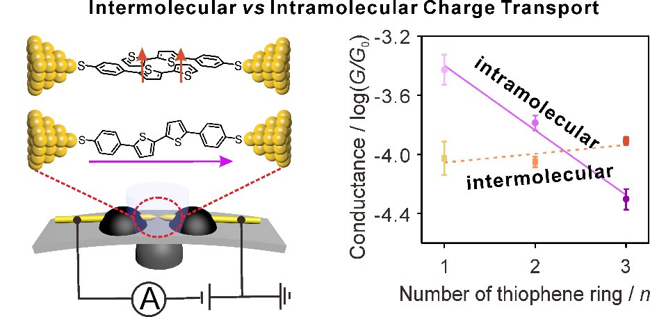 該工作采用機(jī)械可控裂結(jié)技術(shù)通過分別構(gòu)建模擬分子鏈內(nèi)輸運(yùn)的單分子器件和模擬分子鏈間輸運(yùn)的雙分子組裝體器件。研究發(fā)現(xiàn),噻吩單分子器件通過分子鏈內(nèi)的電輸運(yùn)過程中電導(dǎo)隨分子長(zhǎng)度增加呈指數(shù)降低,而噻吩組裝體器件分子間通過分子鏈間電輸運(yùn)過程電導(dǎo)基本不隨分子共軛結(jié)構(gòu)及長(zhǎng)度的變化而改變。表明在單分子尺度,分子鏈間輸運(yùn)甚至可以提供比分子鏈內(nèi)輸運(yùn)更高效的電傳輸途徑。通過分析不同共軛長(zhǎng)度噻吩分子形成雙分子組裝體器件的概率,發(fā)現(xiàn)其隨著分子共軛長(zhǎng)度的增加而提高,證明噻吩分子共軛區(qū)域的增大提升了分子鏈間組裝概率。該工作通過在單分子尺度構(gòu)筑模型分子體系,揭示了噻吩類衍生物分子結(jié)構(gòu)與其電輸運(yùn)性質(zhì)之間的構(gòu)效關(guān)系,為理解聚集態(tài)有機(jī)半導(dǎo)體材料的電輸運(yùn)過程提供了獨(dú)特的視角,也為構(gòu)筑基于分子鏈間電輸運(yùn)作用的新型分子器件開拓了思路。