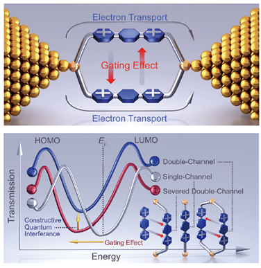 基于上述工作發(fā)展的分子鏈間電輸運(yùn)表征技術(shù),洪文晶教授課題組與諾貝爾獎(jiǎng)得主、美國(guó)西北大學(xué)Fraser Stoddart教授合作,在研究帶電大環(huán)分子體系的量子干涉效應(yīng)中發(fā)現(xiàn),雙通道帶電大環(huán)分子體系的兩條分子鏈間能夠發(fā)生強(qiáng)靜電相互作用,而這一強(qiáng)靜電相互作用可以有效調(diào)控由通過兩條分子鏈內(nèi)電輸運(yùn)的相長(zhǎng)量子干涉效應(yīng),從而實(shí)現(xiàn)相對(duì)單條分子鏈電輸運(yùn)超過50倍的電導(dǎo)增強(qiáng)。這一研究成果驗(yàn)證了分子鏈間非化學(xué)鍵的強(qiáng)靜電相互作用能顯著調(diào)控相消量子干涉效應(yīng),提出了分子鏈間強(qiáng)靜電相互作用的單分子器件“自門控(self-gating)”設(shè)計(jì)新思路。