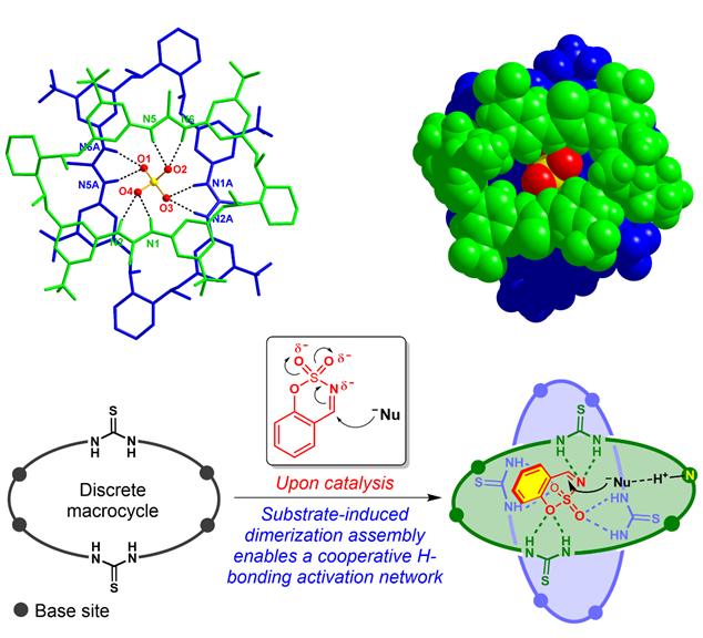 最近,在國家自然科學(xué)基金委和中國科學(xué)院的支持下,中科院化學(xué)研究所分子識別與功能重點實驗室研究員王其強團隊,受酶催化誘導(dǎo)-契合機制啟發(fā),發(fā)展了底物誘導(dǎo)組裝的仿酶協(xié)同不對稱催化策略,實現(xiàn)了高效高選擇性的脫羧曼尼希反應(yīng)。他們設(shè)計合成了一系列四氨基雙硫脲多功能手性大環(huán),發(fā)現(xiàn)這些大環(huán)分子具有相對柔順的構(gòu)象,在硫酸根離子的誘導(dǎo)下能二聚組裝。通過二聚組裝,大環(huán)分子中的硫脲識別位點交互協(xié)同,同時形成一個手性開放口袋,多個叔胺位點位于口袋邊緣。受此啟發(fā),他們將大環(huán)應(yīng)用于催化環(huán)狀醛亞胺與苯基β-酮酸的脫羧曼尼希反應(yīng),設(shè)想經(jīng)過亞胺底物原位誘導(dǎo)大環(huán)催化劑的二聚組裝,觸發(fā)形成高度互補的多重氫鍵活化網(wǎng)絡(luò),進而活化亞胺底物自身,實現(xiàn)高效高選擇性催化。他們發(fā)現(xiàn),對于一系列的亞胺和酮酸底物,僅需5mol%的大環(huán)催化劑上載量,反應(yīng)即可獲得幾乎定量的轉(zhuǎn)化和高達95%ee值。一系列的鍵合研究、原位質(zhì)譜監(jiān)測、動力學(xué)實驗、非線性效應(yīng)、控制實驗以及理論計算結(jié)果,為上述底物誘導(dǎo)組裝的催化機制提供了有力支持。該策略為發(fā)展高效的協(xié)同不對稱催化提供了新思路。