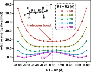 最近,余志祥教授和研究助理王熠博士通過(guò)理論計(jì)算首次提出了對(duì)稱(chēng)C···H···C氫鍵存在的可能性。作者首先以甲烷與甲基負(fù)離子所形成的氫鍵復(fù)合物為例論證了對(duì)稱(chēng)C···H···C氫鍵存在的理論基礎(chǔ)。如圖2所示,當(dāng)兩個(gè)碳原子之間的距離被固定為2.90 ?時(shí),體系展現(xiàn)出了雙勢(shì)阱勢(shì)能面的特征。隨著兩個(gè)碳原子不斷靠近,勢(shì)能面逐漸由雙勢(shì)阱向單勢(shì)阱過(guò)渡。最終,當(dāng)兩個(gè)碳原子之間的距離被縮短至2.50 ?時(shí),體系中首次出現(xiàn)了對(duì)稱(chēng)的碳?xì)涮細(xì)滏I。