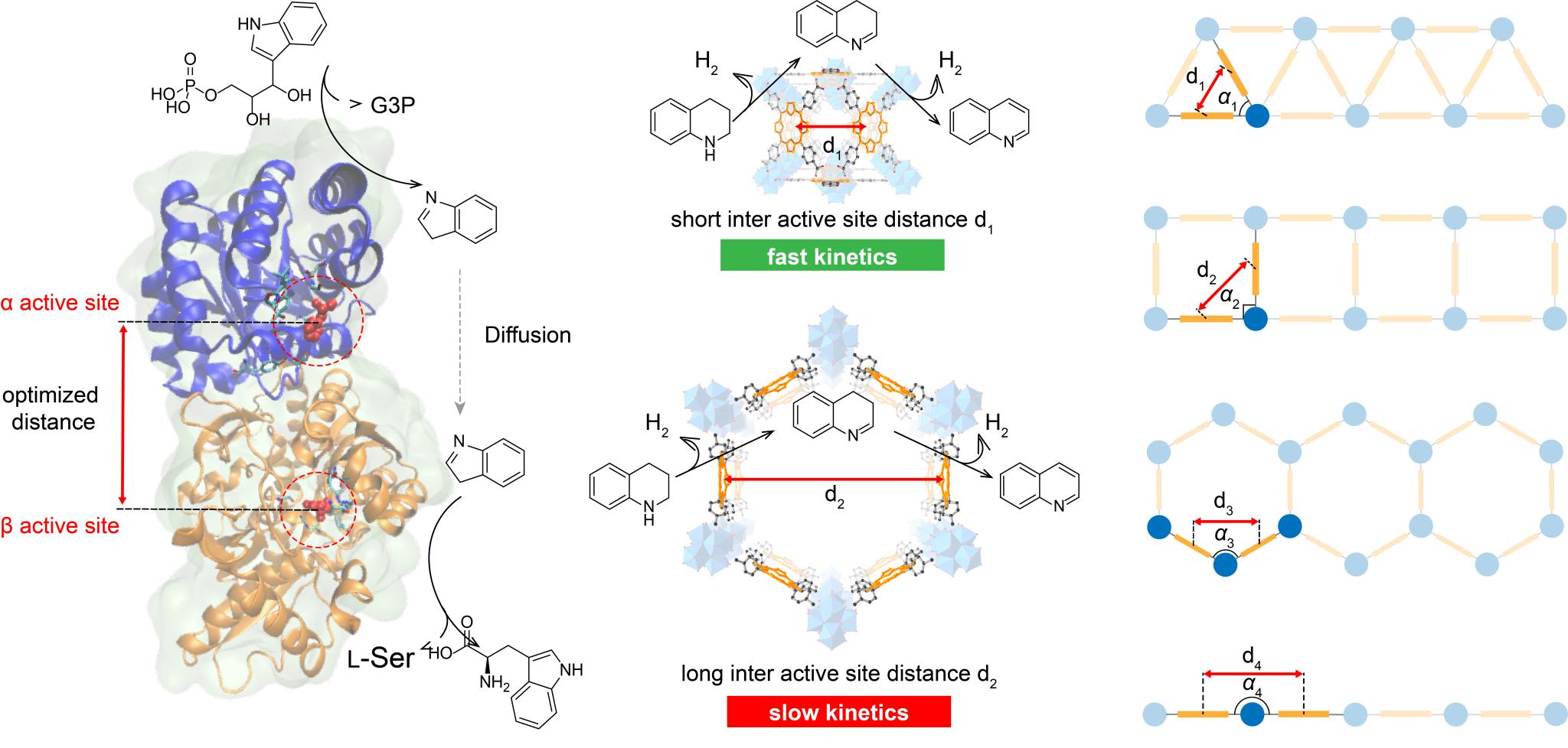 在化學(xué)反應(yīng)中,催化活性位點(diǎn)的空間分布對(duì)于催化劑整體的活性有重要影響。無機(jī)催化劑的設(shè)計(jì)合成通常會(huì)圍繞材料的形貌、顆粒的大小、孔隙率、比表面積、孔的幾何特征、活性位點(diǎn)的密度等方面討論其對(duì)于催化反應(yīng)活性的影響,這些影響因素都至關(guān)重要,但也較為紛繁復(fù)雜,成為催化劑結(jié)構(gòu)設(shè)計(jì)的壁壘。此項(xiàng)研究嘗試將紛繁的影響因素歸一到距離這一基本物理指標(biāo)上,研究活性位點(diǎn)之間的距離對(duì)催化性能的影響。研究者利用金屬有機(jī)框架(metal-organic framework,簡(jiǎn)稱MOF)的結(jié)構(gòu)高度有序和組分結(jié)構(gòu)精確可調(diào)的特性,以基于相同活性有機(jī)配體構(gòu)筑的六種不同的MOF為對(duì)象,在涉及多步反應(yīng)的光催化體系中,系統(tǒng)的探究了活性中心在MOF晶態(tài)結(jié)構(gòu)中的微觀距離對(duì)其宏觀催化性能的影響。揭示了光催化反應(yīng)活性(turnover frequency, TOF)隨活性中心之間的距離(inter active site distance)減小而增加的規(guī)律,并建立合理的公式定量描述其具體關(guān)系。通過在某些特定的晶體結(jié)構(gòu)的位點(diǎn)上的制造缺位的方法,研究者進(jìn)一步設(shè)計(jì)合成了一系列的Jenga MOF,發(fā)現(xiàn)了使其催化活性超越“距離—性能”線性關(guān)系的方法。這些探索和發(fā)現(xiàn)為無機(jī)催化劑的設(shè)計(jì)合成提供了更為豐富的選擇。