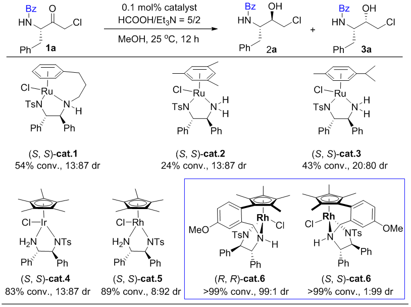 在研究初期,該研究團隊先對近年來發(fā)展的一系列轉(zhuǎn)移氫化催化劑進行了系統(tǒng)篩選,最終發(fā)現(xiàn)催化劑(R,R)-cat 6和(S,S)-cat 6表現(xiàn)出最優(yōu)異的活性和非對映選擇性,能夠以大于99:1的選擇性分別得到兩種不同的氨基氯代醇2和3。通過對反應(yīng)條件的進一步篩選和優(yōu)化,發(fā)現(xiàn)當(dāng)采用二氯甲烷(DCM)作溶劑時,能夠得到最優(yōu)的反應(yīng)活性和選擇性。