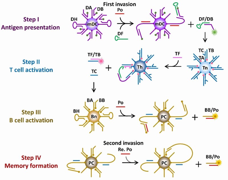 導(dǎo)讀:華東理工大學(xué)生物反應(yīng)器工程國(guó)家重點(diǎn)實(shí)驗(yàn)室葉邦策教授課題組通過模塊化設(shè)計(jì)DNA分子機(jī)器,開發(fā)了一種多DNA機(jī)器交互網(wǎng)絡(luò)系統(tǒng),成功模擬了脊椎動(dòng)物獲得性免疫系統(tǒng)中細(xì)胞與細(xì)胞間通訊對(duì)病原體的識(shí)別、清除以及記憶。通過三種DNA分子機(jī)器分別模擬關(guān)鍵免疫細(xì)胞:樹突狀細(xì)胞(DC)、T細(xì)胞和B細(xì)胞,展示了病原體侵襲過程中DC細(xì)胞、T淋巴細(xì)胞和B淋巴細(xì)胞的連續(xù)激活、抗體分泌、記憶形成和快速高效的二次應(yīng)答。該工作將為DNA分子機(jī)器多樣化設(shè)計(jì)及高級(jí)生物應(yīng)用,如疾病早期診斷治療、藥物智能載運(yùn)和釋放等提供全新的研究思路。