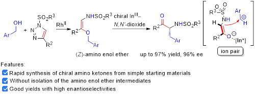 在非手性銠鹽和手性雙氮氧-銦配合物存在下,不同取代的三氮唑可與多種類型的苯甲醇類底物發(fā)生反應,較高收率和高對映選擇性地得到一系列a-氨基酮產(chǎn)物,最優(yōu)結(jié)果高達97%的收率和96%的對映選擇性。通過產(chǎn)物單晶、控制實驗以及動力學研究,我們認為該重排反應經(jīng)歷了離子對機理。