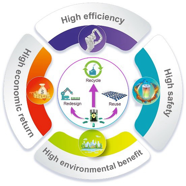 基于強(qiáng)制性或指導(dǎo)性文件的法律、法規(guī)和政策,對美國、德國、日本及中國的電池回收管理模式進(jìn)行分析,研究顯示電池生命周期管理對于廢舊電池溯源管理平臺的建立和回收政策的制定等至關(guān)重要。從戰(zhàn)略資源和經(jīng)濟(jì)需求的角度,對可充電電池的全生命周期評估進(jìn)行詳細(xì)分析,提出了3R策略(Redesign、Reuse、Recycle)和4H原則(High efficiency、High economic return、High environmental benefit、High safety)(見圖2),指出可充電電池可持續(xù)性的未來新挑戰(zhàn)和發(fā)展前景。