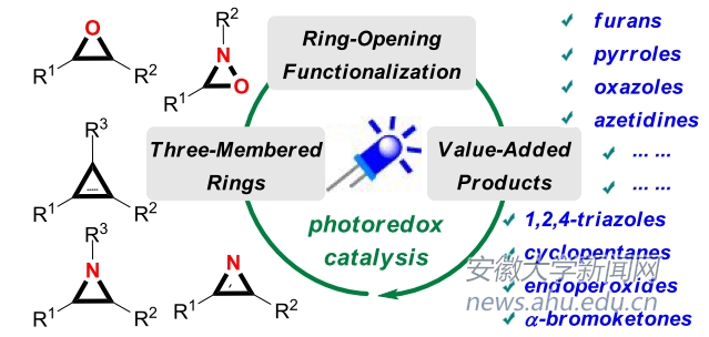 在上述研究基礎(chǔ)上,該團(tuán)隊(duì)近期在英國皇家化學(xué)學(xué)會的旗艦期刊《化學(xué)社會評論》上在線發(fā)表題為Visible Light-Promoted Ring-Opening Functionalization of Three-Membered Carbo- and Heterocycles的綜述文章,對包括2H-氮雜環(huán)丙烯、環(huán)丙烷、環(huán)丙烯、環(huán)氧乙烷、氮雜環(huán)丙烷和啞嗪等六大類三元環(huán)狀化合物的光誘導(dǎo)開環(huán)官能化反應(yīng)做了全面分析總結(jié)。文章從合成光化學(xué)的背景切入,分類介紹了上述六種三元雜環(huán)化合物在光促開環(huán)官能化反應(yīng)方面不同的反應(yīng)類型、反應(yīng)原理和局限性,并展望了這類化合物在合成光化學(xué)領(lǐng)域未來的發(fā)展方向(圖2)( Chem. Soc. Rev. 2020, DOI:10.1039/C9CS00523D, IF = 40.443)。該論文的第一作者是我校碩士研究生何向奎,安徽大學(xué)為第一通訊單位。