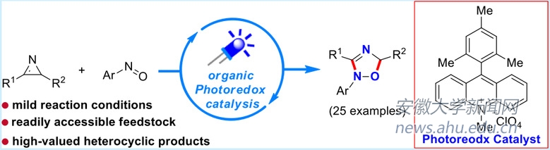近日,安徽大學(xué)化學(xué)化工學(xué)院宣俊教授團(tuán)隊(duì)和華中師范大學(xué)肖文精教授團(tuán)隊(duì)合作,在可見光促進(jìn)的2H-氮雜環(huán)丙烯開環(huán)官能化反應(yīng)方面取得了最新研究進(jìn)展。研究發(fā)現(xiàn),使用亞硝基芳基化合物作為自由基受體,可有效捕捉光誘導(dǎo)2H-氮雜環(huán)丙烯開環(huán)所產(chǎn)生的自由基陽離子中間體。該反應(yīng)為1,2,4-噁二唑化合物的光化學(xué)合成提供了一條綠色高效的途徑(圖1)。該項(xiàng)研究成果以《[3+2]-Cycloaddition of 2H?Azirines with Nitrosoarenes: Visible-Light-Promoted Synthesis of 2,5-Dihydro-1,2,4-oxadiazoles》為題發(fā)表于美國化學(xué)會的《有機(jī)快報(bào)》上(Org. Lett. 2019, 21, 4234-4238,自然指數(shù)期刊,IF = 6.555)。我校化學(xué)化工學(xué)院碩士研究生蔡寶貴為該論文的第一作者,安徽大學(xué)為論文的第一通訊單位。同時(shí),該課題組還利用可見光作為綠色能源,實(shí)現(xiàn)了3-酰基喹喔啉酮(Adv. Synth. Catal. 2020, DOI:10.1002/adsc.202000116)、色螨酮(Sci. Bull. 2019, 64, 337; Chem. Asian J. 2019, 14, 3269;)等多種重要含氮雜環(huán)化合物的光化學(xué)合成。