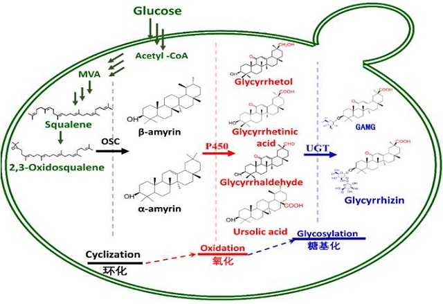中藥方劑中的十方九草中的“草”指的就是傳統(tǒng)中藥甘草,又稱國老,具有清熱解毒之功效又用以調(diào)和諸藥。其中,甘草三萜是甘草的主要活性成分,如甘草酸及其衍生物等具有抗病毒、抗腫瘤、抗炎癥等多種生理活性同時又不抑制人體免疫系統(tǒng),是肝臟炎癥治療中的抗炎癥藥物代表。當(dāng)前,在湖北抗擊新冠肺炎治療中使用的甘草酸二胺組合維生素C發(fā)揮了積極作用。李春教授課題組前期開創(chuàng)性地利用微生物合成植物甘草中主要三萜類化合物的系列研究(單葡萄醛酸基甘草次酸Chem Eng Sci 2014;β-香樹脂醇AIChE Journal 2015;角鯊烯Chem Eng Sci 2016A和2016B;α-香樹脂醇ACS Synthetic Biology 2018;甘草次酸Metabolic Engineering 2018;催化關(guān)鍵酶J Biological Chem 2018和J Physical Chem Lett 2018;甘草次酸衍生物J Agric Food Chem 2019和Critical Rev in Biotechnol 2019;甘草稀有三萜ACS Catalysis 2020),有望解決目前挖根提酸、破壞植被與生態(tài)的不可持續(xù)的獲取方式(研究過程見下圖)。然而,甘草中還存在一些含量極低、具有重要生理功能的稀有三萜化合物包括甘草次醇、甘草次醛以及甘草次醇的同分異構(gòu)體等。它們除了具有重要的生理活性外,這些稀有三萜分子骨架上的羥基、醛基等功能基團(tuán)的存在為對其進(jìn)一步修飾,從而獲得結(jié)構(gòu)更加多樣、功能更加豐富的新型衍生物提供了可能。但這些稀有三萜在甘草根中含量極低以及復(fù)雜的分子結(jié)構(gòu),導(dǎo)致這類化合物難以直接提取或化學(xué)合成制備。
